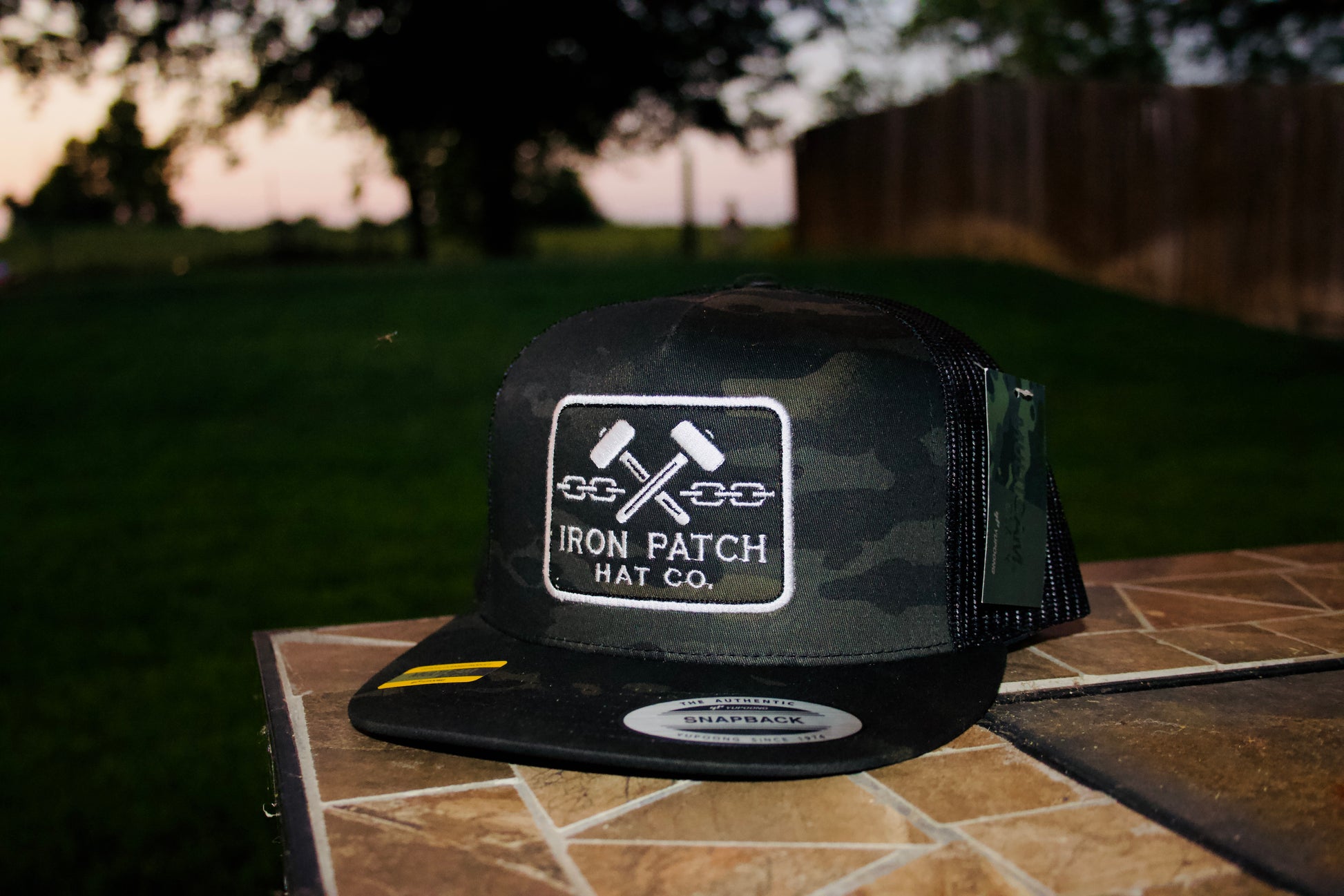 Camo front with a black mesh back, featuring crossed hammers and chain link embroidery. Rugged style for the outdoors or the work site