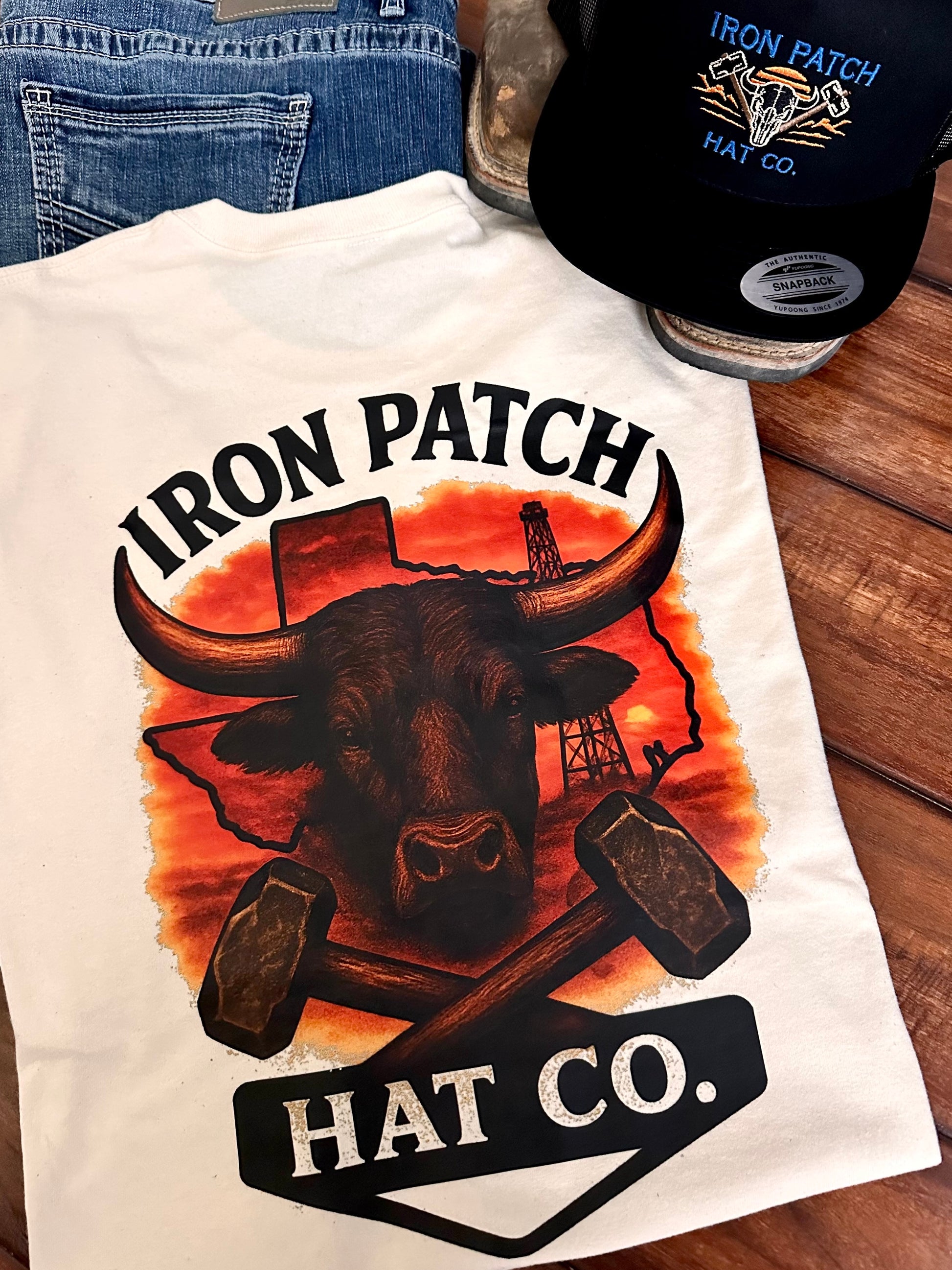 This is the one that started conversations. The Hammer & Horns Tee brings the heart of Texas and the oilfield straight to your back — featuring a bold bull head framed by a blazing sunset, crossed sledge hammers, and the Iron Patch Hat Co. name in classic style.