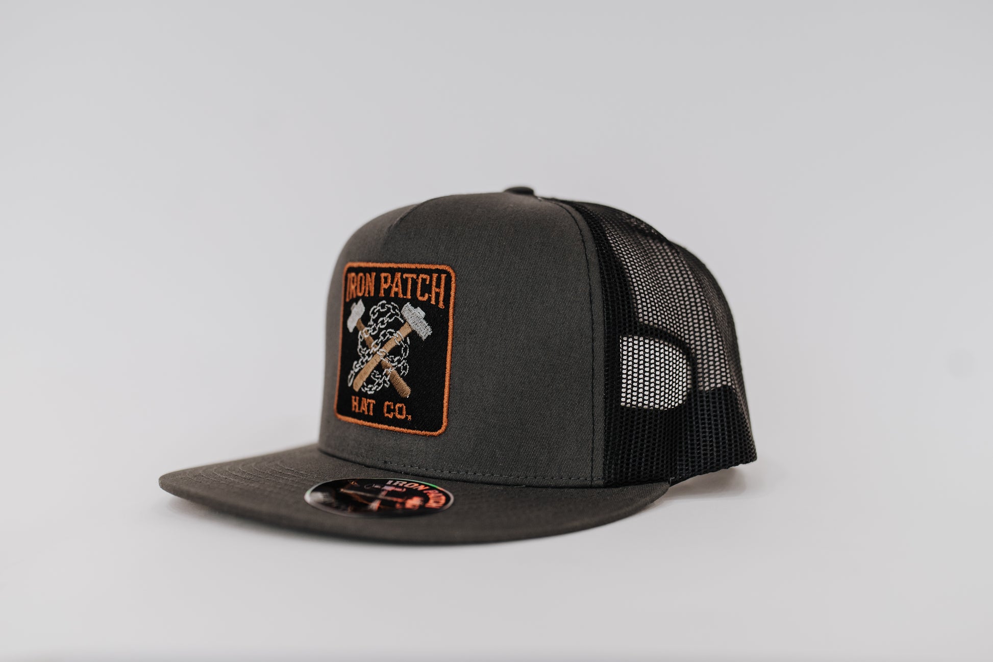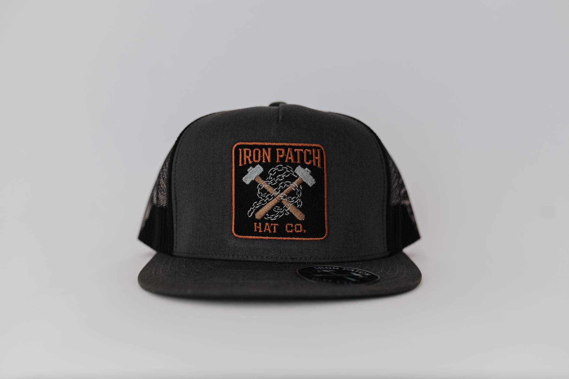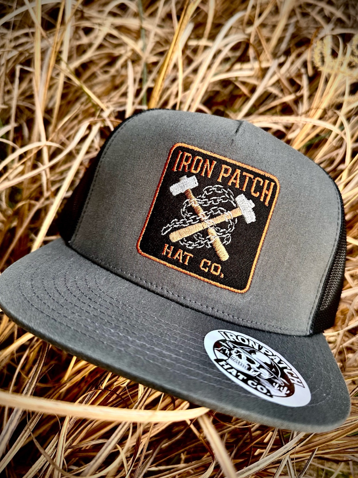 Grey Yupoong structured cap with a black square patch featuring crossed hammers and chain detailing. Finished with a black mesh back for breathability and an adjustable snapback closure for a comfortable fit.