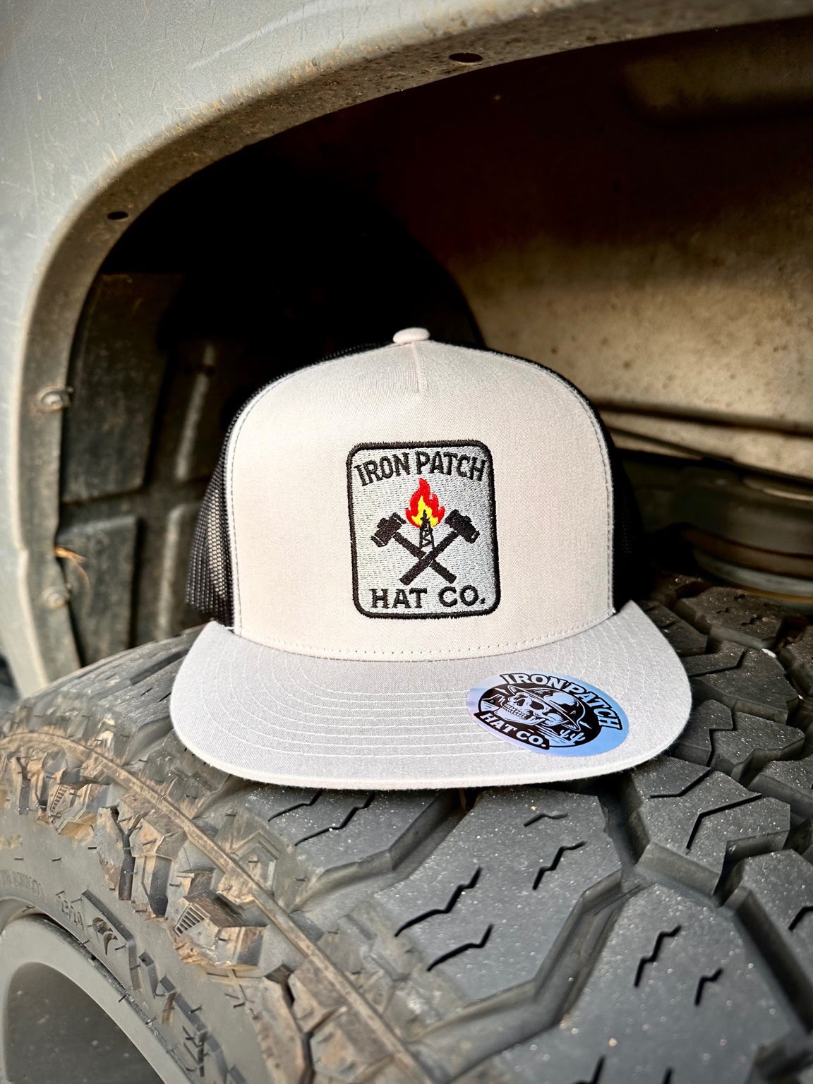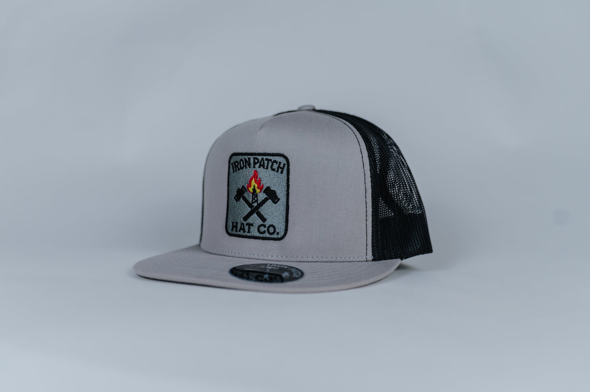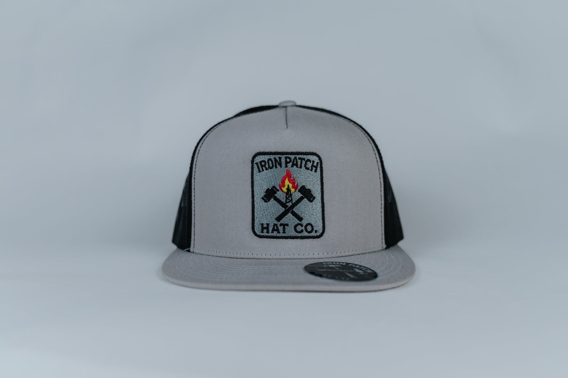 silver Yupoong snapback with a structured front panel and black mesh back. Features an embroidered Iron Patch Hat Co. patch with crossed sledgehammers and rig on fire. Muster Point is a nod to the place where everything comes together. built around strength, readiness, and purpose. Flat bill with Iron Patch Hat Co. branding sticker. Designed for everyday wear with a durable, structured fit.