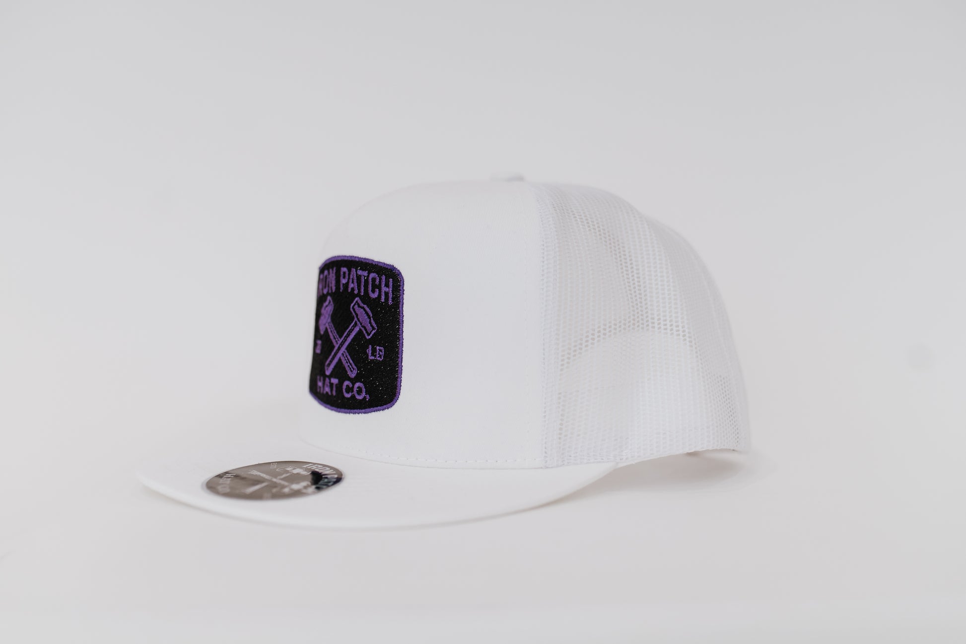 Clean white canvas with a purple-edged patch and crossed hammers. Flatbill style with structured front and mesh backing. Snapback adjustable.